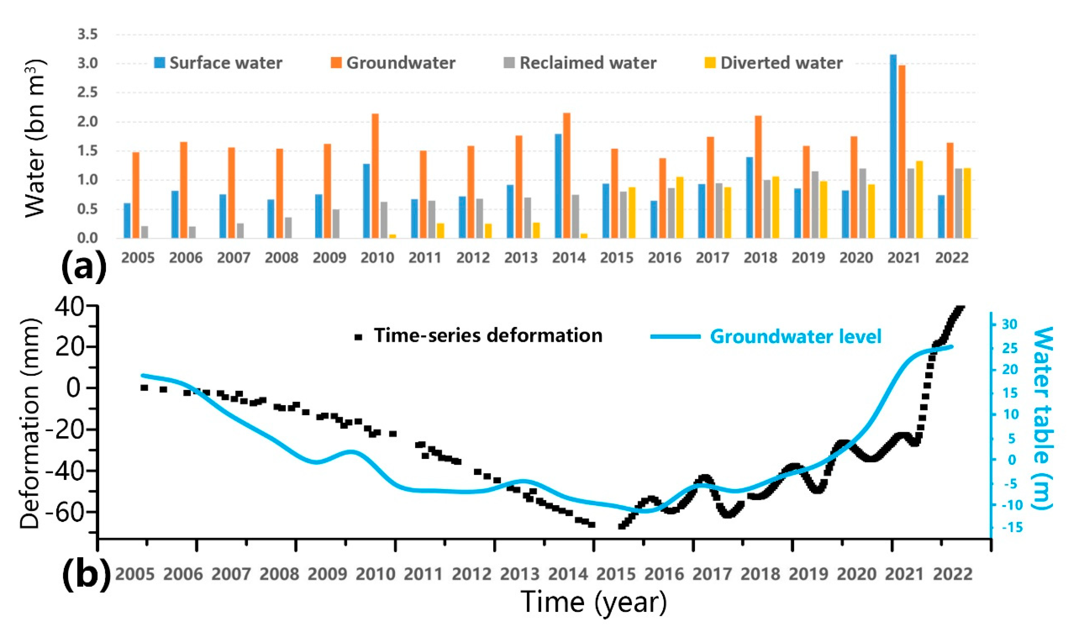 After 2015, with the reduction in groundwater extraction accompanied by a new supply of surface water from the south and coupled with several years of increased rainfall, the water table in the Beijing Plain area has risen. In this new hydrological environment, there remain questions about future ground surface subsidence and uplift. There is still insufficient analysis and discussion as to whether areas with rising groundwater levels will experience a slowdown in ground subsidence or, alternatively, uplift. Additionally, the extent to which the general rise in the water table contributes to the mitigation of ground deformation has yet to be effectively analyzed or discussed.