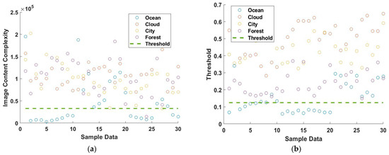 Scatter plot of image content complexity and optimal threshold degree for four datasets: (a) Scatter plot with complex image content; (b) Scatter plot of optimal threshold.