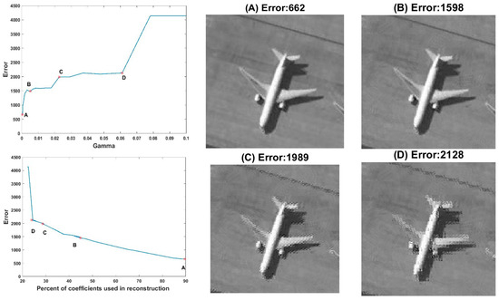 The test results are shown in Figure 7. As increases, the reconstruction error increases and the percentage of coefficients used for reconstruction decreases. To further observe the reconstruction effect, the reconstruction effect diagram is displayed at four different positions on the curve. From an empirical perspective, point (B) is the highest error that can be tolerated, and the reconstruction effect is good. To sum up, the sparsity judgment threshold is the optimal value (or close enough to the optimal value).