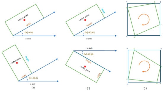 Three methods of defining a rotating bounding box. (a) The opencv definition method; (b) the long–edge definition method; (c) the ordered quadrilateral definition method. where a–d in different colours represent the coordinates of the four corner points of the horizontal and rotating bounding boxes, respectively.