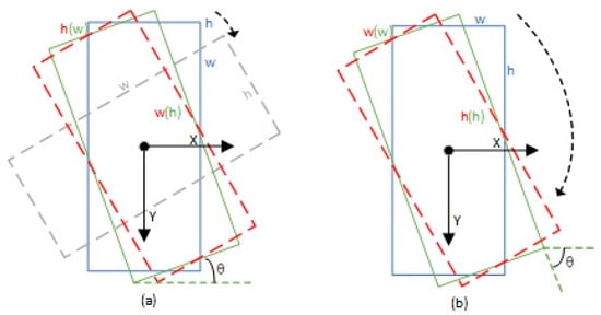 The boundary problem for the opencv method and the long-edge method. (a) The opencv definition method based on 90° regression; (b) the long-edge definition method based on 180° regression. The blue colour represents the proposal box, the green colour represents the ground truth box and the red colour represents the predict box.