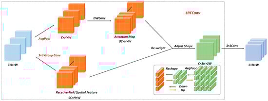 The LRFConv module is designed to improve the ability to extract detailed and complex information from SAR images. The module is designed based on RFAConv []. The distinguishing feature of traditional convolutional operations is the use of a convolutional kernel with shared parameters to extract features. Shared parameters cause the convolution to process each pixel equally, without taking into account the different importances of each pixel. We therefore replace some of the traditional convolution operations with LRFConv. This structure adjusts the weights of feature pixels within different sensory fields to highlight the details and complex information needed for important ship classification. The LRFConv structure is shown in Figure 5.