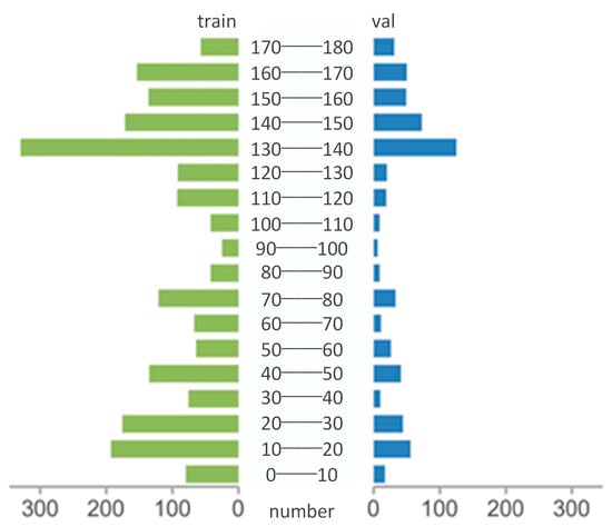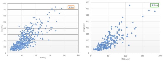 Length and width distribution of rotated bounding boxes in training set and validation set.