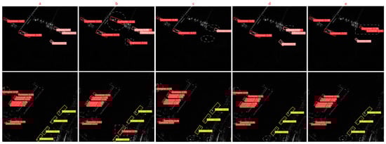 In the following visualization results, the white rectangular box represents a miscarriage of justice, the white circular box represents a misdetection, the white elliptical box represents a missed detection, yellow represents ore–oil ships, orange represents cell–container ships, pink represents fishing ships, green represents law enforcement ships, brown represents dredger ships, and red represents container ships. From the comparison of the visualization results in Figure 8, we can find that the C2fBT can accurately detect densely packed ships and achieve accurate category classification for ships whose categories are easily confused in some in-shore scenarios.
