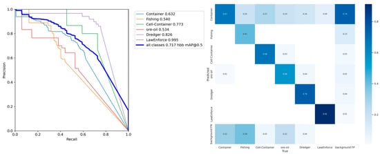 Figure 10 illustrates the Precision–Recall Curve (PRC) and the confusion matrix of R-LRBPNet. The confusion matrix can effectively show the accuracy of the network’s classification of ships, where the horizontal coordinate is the actual category and the vertical coordinate is the predicted category. The diagonal line represents the probability of correct classification and the others the probability of misclassification. It can be seen that the network achieves the best detection performance for law enforcement ships, with little misclassification. Container ships, cell–container ships and dredger ships are also detected with relatively high accuracy, with an accuracy only slightly lower than that for law enforcement ships. There are more cases of misclassification for fishing ships compared to the other categories. It can be seen that the model easily identifies fishing ships as container ships or background true negatives, although the R-LRBPNet achieves an AP value of 54.5% for fishing ships, which is the highest value of all compared methods. Compared to recent rotating ship detection and classification methods [,,] based on the SRSDD dataset, R-LRBPNet shows better performance. This is reflected not only in quantitative metrics such as detection accuracy and recall, but also in its ability to accurately detect different classifications of ship targets.