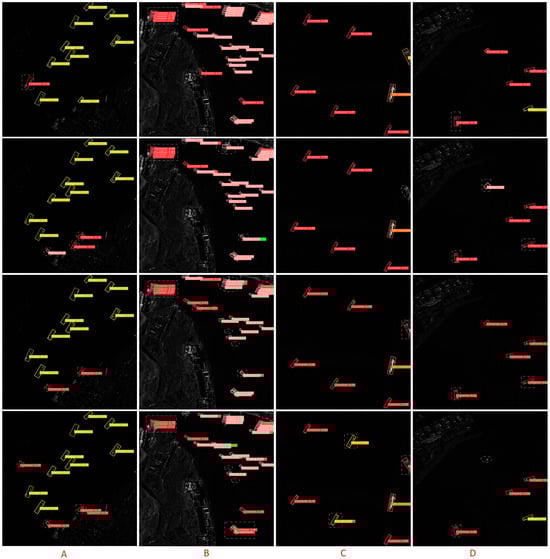 Visual results of detection and classification of off-shore scenes by different methods in SRSDD-v1.0 dataset. (A) R-LRBPNet; (B) O-RCNN; (C) R-FCOS; (D) R-YOLOV8.