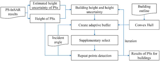 The proposed method is carried out based on building contour vector data [35,36] and PS-InSAR data processing results. Figure 1 presents a flow chart showing the strategy consisting of four major processing steps.
