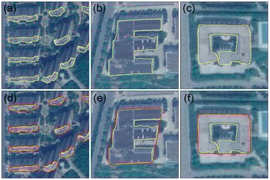 The figure shows building outlines (yellow) and convex hull (red). Building deformation in satellite images (a); irregular building, concave polygon (b); building with holes (c). (d–f) represent the corresponding convex hulls.