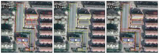 When the range of the convex hull far exceeds the original range of the building, the building can be split to reduce the overlapping of adjacent building convex hulls (Figure 3). In Figure 3a, the area of the irregular building contour in the middle is approximately 4295 m2, while the generated convex hull area is 8205 m2, which covers other surrounding buildings and affects the matching process. Through segmentation, this problem was effectively solved (Figure 3c).