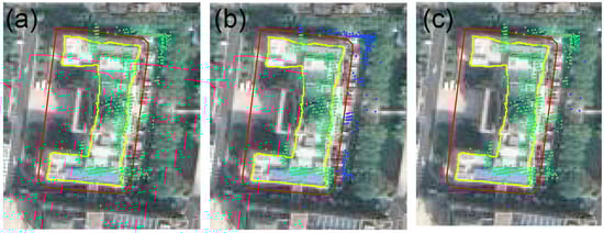 The figure shows the supplementary selection. The yellow polygon represents the building contour, and the red polygon represents the adaptive buffer. (a) Original point data (shown in green); (b) rough matching results (green); (c) supplementary selection results (green); blue represents the rest of the original point data.