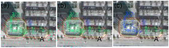 Figure 12 shows a comparison of the matching effect between the conventional approach and the new strategy. The traditional method used a fixed buffer distance of 3.1 m to screen out PS points located in the buffer, matching a total of 785,896 PS points. However, the new strategy matches 1,015,090 PS points, an increase of 29.2%. It is worth noting that this ratio is related to the size of the study area, the intensity of PS points, and other factors, which are not stable. It can be seen that the PS points added by the new strategy show aggregation and strong linear characteristics, meaning that it can be qualitatively determined that these PS points belong to buildings. Although the new strategy may over-match a few PS points, this over-match will not have a significant effect due to the clustering effect of the deformation features. Over-matched PS points include deformation information that does not belong to the building, and if this deformation has a large value and thus affects the risk rating of the building, it is considered overestimated. Conversely, poorly matched PS points and PS points with important deformation information are omitted, resulting in a lower risk rating for the building, which is an underestimate. From a risk perspective, overestimation can lead to overprotection and wasted resources, but underestimating safety risks can lead to incalculable losses of life and property damage. Therefore, underestimation is more serious than overestimation.