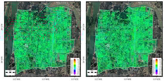 The deformation monitoring results of the ascending and descending tracks are used to accurately match the PS points to the building contour to verify the effectiveness of the method proposed in this paper. Figure 11a,b show the partial results after matching the PS points of the ascending and descending orbits, respectively. It can be seen that the deviation direction of PS points on different orbits is different. Nevertheless, using the method proposed in this study, it is possible to match the PS point results of both the ascending and descending tracks based on the same building contour data. The results show that the matching effect is good. PS points with clustering and spatial distribution characteristics are correctly assigned to buildings. However, this can only enable a qualitative analysis of the matching effect through manual visual inspection, and quantitative evaluation cannot be conducted due to the lack of true values.