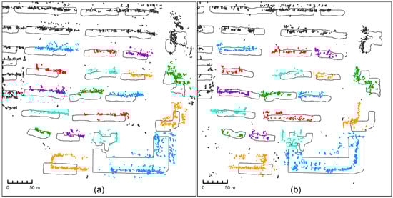 The figure shows the accurate matching results between PS points and building contours. (a) is the result of the ascending orbit data, and (b) is the result of the descending orbit data. Color represents the matching situation of each building, black dots represent the original PS points, and the building contours are represented by solid black lines.