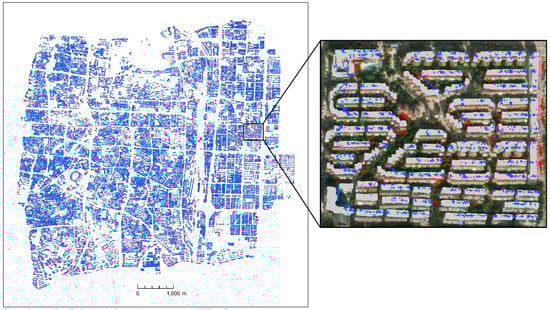 The figure shows an overlay of the results of the conventional method and new strategy. The gray areas represent the buildings, the blue dots represent the results of the traditional method, and the red dots represent the additional matching points of the new strategy.