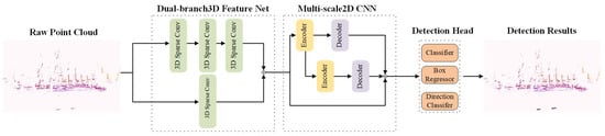 The architecture of the Ship Detector is illustrated in Figure 2. Our detector is composed of three segments: a dual-branch sparse 3D feature extraction module, a multi-scale 2D CNN, and a detection head. The dual-branch sparse 3D feature extraction module processes the raw point cloud by converting it into voxel and coordinates, and then applies sparse 3D convolution to transform the point cloud into feature maps. Subsequently, the multi-scale 2D CNN extracts multi-scale features from these feature maps. Finally, the detection head is used for classification, regression, and direction prediction.