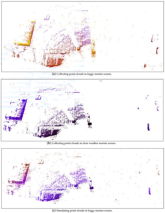 Figure 3a,b depict 3D visualizations of the port scene when a sensor is placed in the same location during a foggy morning and a clear noon, respectively. Evidently, in Figure 3a, there is noise interference around the buildings due to the impact of the fog. The point cloud in Figure 3b exhibits less noise and clearer targets under clear weather conditions. The scanning distance is longer in clear weather than in foggy conditions because of the absence of particulate matter. Figure 3c simulates foggy weather data under clear weather data conditions. Figure 3c shows that when simulating more distant objects, the sparsity of the points resembles the sparsity of the actual point cloud in foggy conditions. The building area also simulates the noise distribution found in actual foggy weather collections.