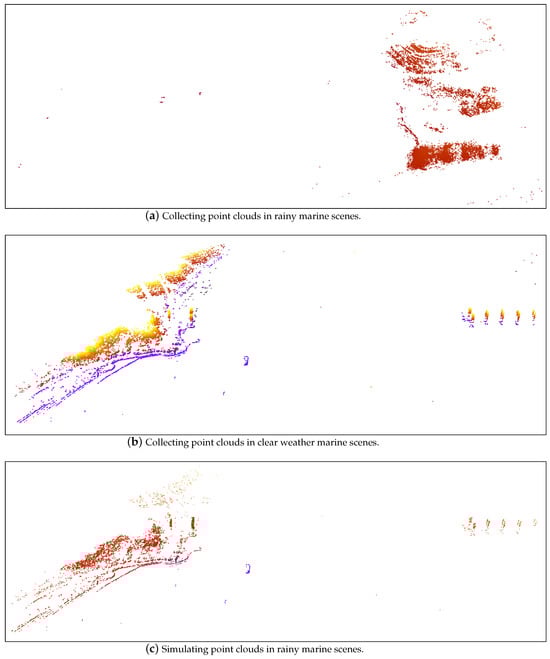 Due to data collection constraints, we did not obtain data for the same scene in both rainy and clear conditions. Fortunately, we managed to collect data on different island scenes in both weather conditions. Figure 4a shows a visualized point cloud of an island during rainy weather, and Figure 4b depicts the island scene under clear weather conditions. Fog contains impurities, resulting in noise during data collection. In rainy weather, the laser beams emitted by the LiDAR can penetrate through raindrops, but the scattering and refraction by the raindrops lead to a reduction in point collection. Following this principle, a rainy scene simulated using data from clear weather conditions is shown in Figure 4c.
