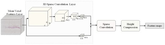 The dual-branch sparse 3D feature extraction net, as shown in Figure 5, is utilized to extract pointwise features from the raw input point clouds and subsequently fuse these into feature maps. In Figure 5, the input point cloud features are , representing the coordinates and reflectivity of the point cloud. The output feature maps have dimensions of , where H, W, and L respectively denote the height, width, and length of the voxelized point cloud. It comprises three primary modules: the mean voxel feature module, the 3D sparse convolution module, and the height compression module. Each of these modules is further detailed in the following section.