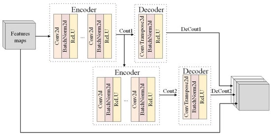 The structure of the multi-scale 2D CNN module. The encoder layers, consisting of convolution, batch normalization, and ReLU, progressively compress the data, encoding the spatial hierarchy. Decoders then upsample these encoded features, aiming to preserve critical spatial information. The feature maps and the features after encoding and decoding are combined as output.