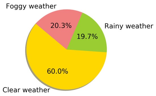 Owing to the mounting angle of the sensor, the collected data encompass marine scenes within a range extending 1 nautical mile in the positive direction of the Y axis. The clear weather conditions datasets include four types of ships: ‘Cargo Ship’, ‘Engineering Vessel’, ‘Tour Boat’, and ‘Speedboat’. They are divided into 6964 frames for training and 1425 frames for testing. Clear weather point clouds are converted into adverse weather point clouds using the simulation methods for foggy and rainy conditions described in Section 4. The proportions of training data for clear, rainy, and foggy conditions in the adverse weather dataset are shown in Figure 7.