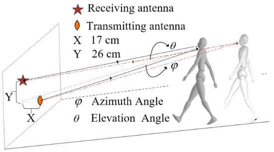 Configuration of SISO UWB radar for human pose estimation showing the relative positioning of the transmitting and receiving antennas, and the azimuth and elevation angles to the moving human target.