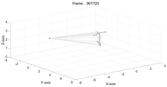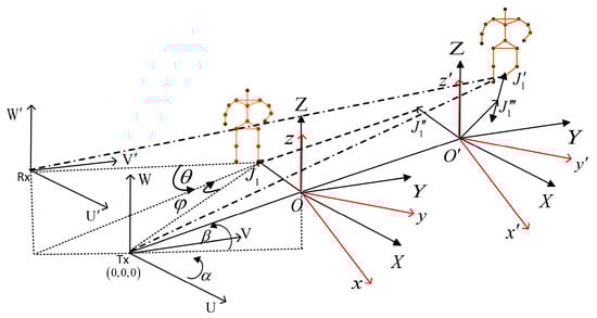Assume that the position of the left foot bone of the moving human target at the initial time is designed as , and the position vector in the global coordinate system is . During the observed period, point undergoes four simultaneous movements characterized by their distinct kinematic properties.