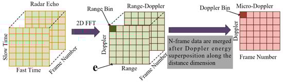 The radar data preprocessing chain chart is shown in Figure 3, which outlines the process from raw radar data to the final output. The first steps in this process involve applying clutter suppression and noise reduction techniques to boost the signal-to-noise ratio and reduce unwanted interference. Next, the fast Fourier transform (FFT) is used along the fast-time dimension of the raw radar data to produce a range bin. Then, the FFT is applied along the slow-time dimension to create multiple Range-Doppler maps, as illustrated in Figure 3, referred to as Range-FFT and Doppler-FFT. The Range-FFT calculates the target distance for each chirp in the original data matrix, while the Doppler-FFT helps determine target velocities for each distance unit. Each element in the resulting Range-Doppler maps is known as a “Range Bin” and is represented in the frequency domain and expressed in decibels. The next step involves summing the Range Bins along the range axis for each Range-Doppler map, generating a vector comprising L Doppler Bins. Finally, concatenating n consecutive frames produces a time-length n-frame micro-Doppler signature map, which is also known as a time-Doppler spectrogram.