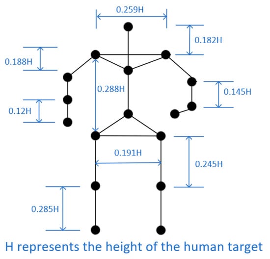 Based on experimental data, the proportionate lengths of different human body parts were calculated and are presented in Figure 5. According to the data, the segment from the top of the head to the bottom of the neck makes up 18.2% of the body’s height, the shoulders constitute 25.9%, and the torso accounts for 28.8%. Additionally, the upper arms represent 18.8% of the length, the lower arms 14.5%, the thighs 24.5%, the calves 28.5%, and the hips 19.1%.
