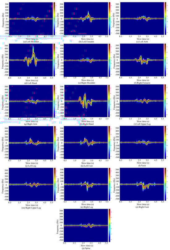 The human body is an asymmetric, non-rigid structure with bilateral symmetry, and during human movement, it follows specific patterns caused by the MD effects. In Figure 8, the left and right sides of the human body are represented in the first and third rows and second and fourth rows, respectively, to facilitate a comparative analysis of the MD effects resulting from micro-movements in the left and right structures of the moving human subject. For instance, Figure 8c,g showcase the left and right arms resembling a left–right symmetrical structure. To maintain balance during most movements, the arms often exhibit symmetrical or reverse symmetrical movements centered around the trunk.