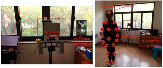 Our UWB radar system utilizes a single transmitter and receiver channel, as shown in Figure 9. This system is co-located with a inter realsense camera and the Noitom Perception Neuron 3 (N3) system, simultaneously capturing the subjects’ radar returns and velocity information. To collect data comprehensively, we set up the UWB radar, a camera, the N3 device, and a personal computer (PC). The UWB radar acquires radar data, whereas the camera captures scene imagery. The N3 device employs a 2.4G wireless method to collect data on skeletal key-points of the human body. The PC synchronizes data across these three sensors, ensuring cohesive and aligned data capture for subsequent analysis.