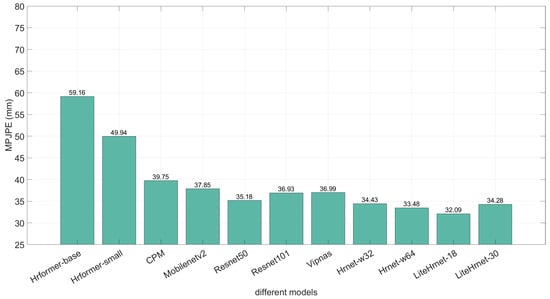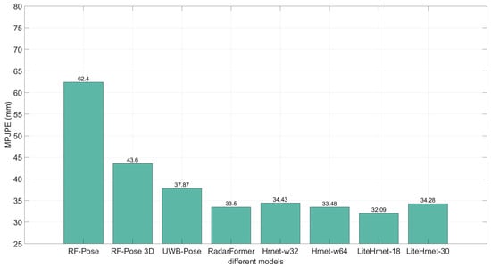 Figure 18 visualizes the performance of four models in estimating human poses across various predefined motions using the mean per-joint position error (MPJPE) metric, which is commonly used in human pose estimation tasks to measure a model’s accuracy. This metric measures the accuracy of a model by calculating the average distance between the predicted and true joint locations across all tested poses. The four models compared are two versions of the Hrnet models (Hrnet-w32 and Hrnet-w64) and two versions of the LiteHrnet models (LiteHrnet-18 and LiteHrnet-30) that are designed to capture the spatial hierarchies in human poses by connecting high-to-low-resolution convolutions in parallel and exchanging information across resolutions.
