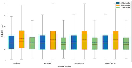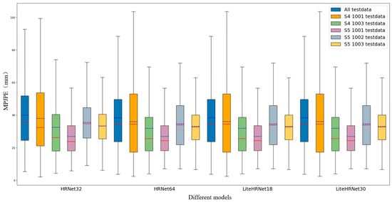 Comparative boxplot analysis of MPJPE across the Hrnet32, Hrnet64, LiteHrnet18, and LiteHrnet30 models using S4, S5, and all test data in the HPSUR dataset.