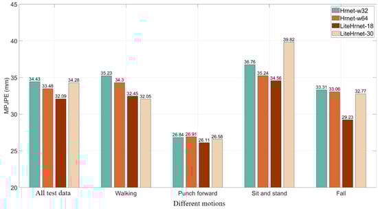 Bar graph comparing the MPJPE of two variants of Hrnet (Hrnet-w32 and Hrnet-w64) and two variants of LiteHrnet (LiteHrnet-18 and LiteHrnet-30) models across different motions.