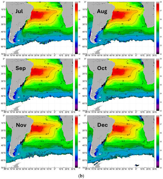 (a) Long-term (2011–2019) mean monthly SSS in the Rio de la Plata outflow region, January–June. (b) Long-term (2011–2019) mean monthly SSS in the Rio de la Plata outflow region, July–December.