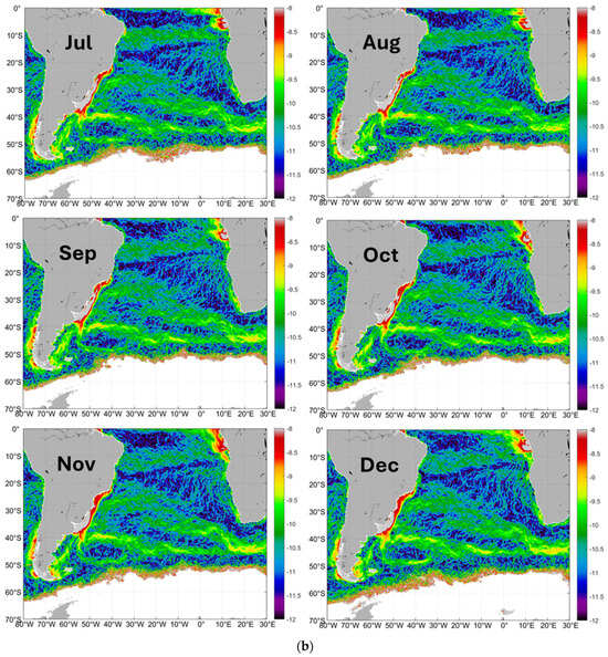 (a) Log-transformed gradient magnitude GM of sea surface salinity SSS, January–June. (b) Log-transformed gradient magnitude GM of sea surface salinity SSS, July–December.
