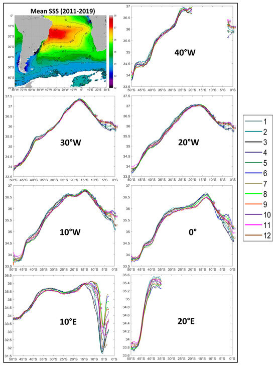 Long-term (2011–2019) mean monthly distributions of SSS along 7 meridians between 40°W and 20°E from the equator to 50°S. Monthly curves are numbered as in the legend (1 January, … 12 December).