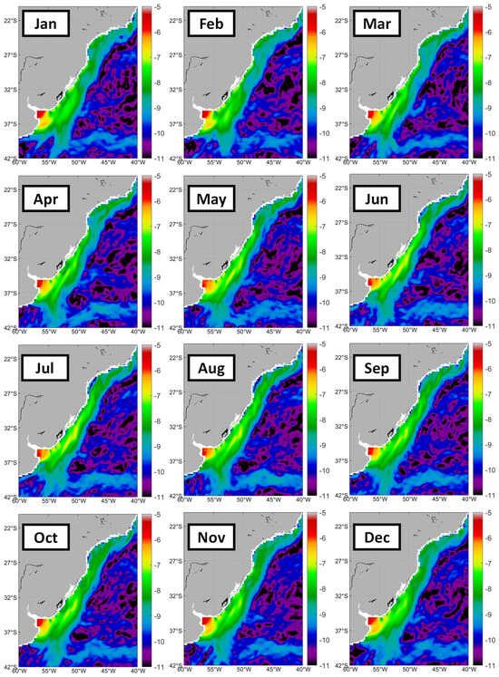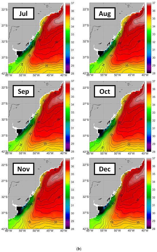 The Rio de la Plata plume features prominently in the salinity field. The Plata discharges over 22,000 m3/s on average, and up to 60,000 m3/s at maximum (Guerrero et al., 1997 [60]; Piola et al., 2005 [61]; Acha et al., 2008 [62]; Campos et al., 2008 [63]). The Plata discharge is made of two major components, Paraná and Uruguay, that are anticorrelated; therefore, the seasonal variations of Plata discharge are relatively small, varying between 20,000 and 27,000 m3/s according to Figure 8 in Dogliotti et al. (2016) [64], based on discharge data by Borús and Giacosa (2014) [65]. The first-ever synoptic aerial survey of the Plata Plume in winter 2003 documented the Plume’s northward extent of 1100 km up to Itajaí (Brazil) at 27°S (Burrage et al., 2008) [66]. According to the modeling study by Piola et al. (2005) [61], the Plata Plume extends north for up to 1300 km. In winter 1993, following an anomalously high Plata discharge, Plata water extended north by 1500 km up to 23°S (Campos et al., 1996 [67]; Campos et al., 1999 [68]; Campos et al., 2008 [63]). Analysis of historical precedents by Campos et al. (1999) [68] showed that the penetration of Plata water into the South Brazil Bight is not an unusual event. The Plata water’s northward penetration is driven largely by wind stress rather than variations in the Plata discharge (Palma et al., 2008) [69].