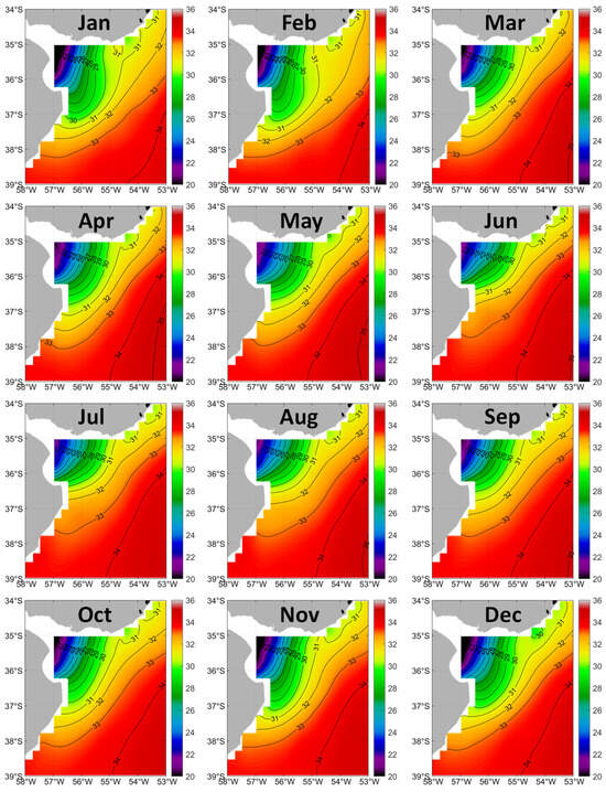 Long-term (2011–2019) mean monthly maps of SSS in the Plata Estuary region.