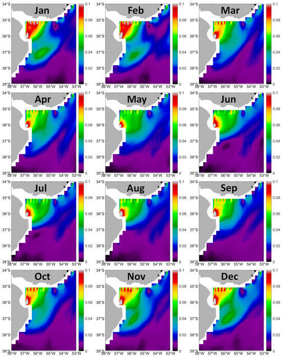 Long-term (2011–2019) mean monthly maps of SSS gradient magnitude in the Plata Estuary region. Red fingers along the northern flank of the estuary are likely artifacts since their scale is smaller than the resolution of the original SSS data.