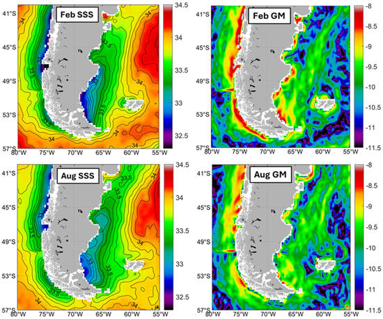 Long-term (2011–2019) mean monthly maps of SSS and log-transformed gradient magnitude GM of SSS in mid-summer (February) and mid-winter (August) in the Magellan Strait outflow region.