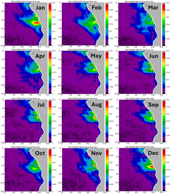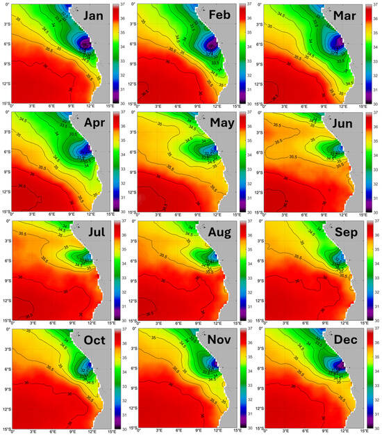 Long-term (2011–2019) mean monthly maps of SSS in the Congo River outflow region.