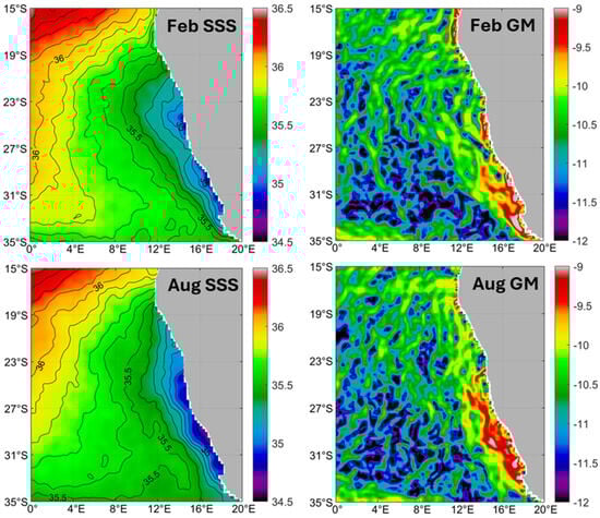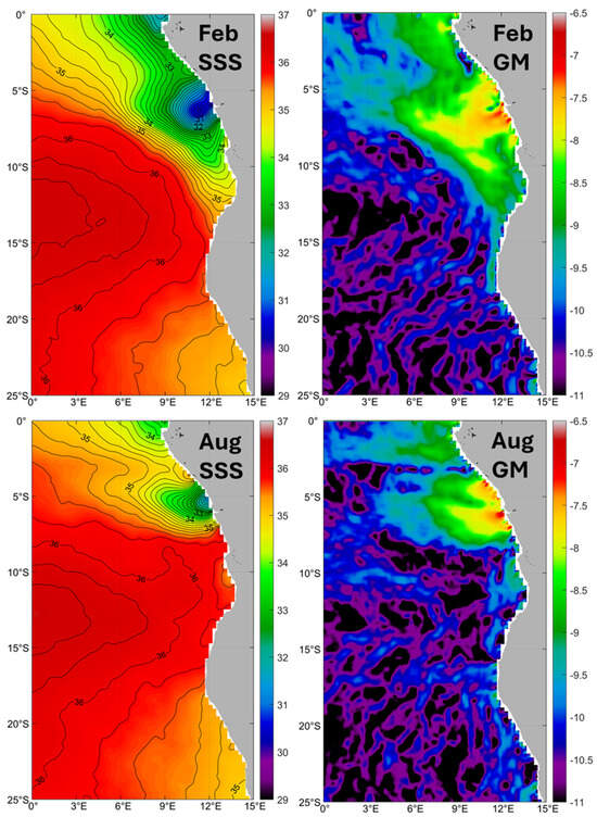 Long-term (2011–2019) mean monthly maps of SSS and log-transformed gradient magnitude GM of SSS in mid-summer (February) and mid-winter (August) in the Congo-Angola-Benguela region.