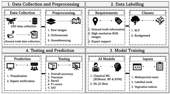 Processing pipeline for BLP identification using UAV-based spectral data and AI.