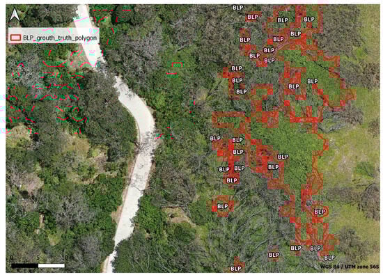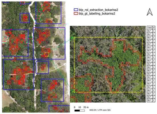 The labelling process was conducted exclusively for the BLP class, while the remaining areas (background class including other vegetation and non-vegetation) were left unlabeled using image analyst extension tool in ArcGIS Pro 3.1. The data labeling begins with the application of georeferenced high-resolution RGB imagery, ensuring spatial accuracy for subsequent analysis. Ground truth polygons delineating BLP, as detailed in Section 2.4, are overlaid onto the RGB imagery. These ground truth polygons are thoroughly verified by domain experts to ensure accuracy. BLP identification characteristics such as leaf serrations, leaf arrangement, and leaf colour were taken into consideration for labelling purposes. Leveraging the Image Analyst extension tool within ArcGIS Pro, specifically the Classification Wizard and Training Sample Manager functionalities, enables precise labeling of BLP. Drawing tools are employed to manually digitise polygons or points encapsulating BLP class. Each labeled feature is assigned a class ID value, typically denoted as “1”, representing the presence of BLP. Subsequently, the labeled dataset is saved or converted to a GIS vector file format, accompanied by an attribute table containing pertinent information. Figure 6 shows the ground truth labeling of BLP at the Bokarina site with selected ROIs.