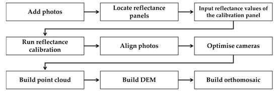 The MS and RGB data obtained from the survey missions along the coastal region were postprocessed to obtain georeferenced orthomosaics. The MS orthomosaics were generated using Agisoft Metashape 1.6.6 (Agisoft LLC, Petersburg, Russia) and the RGB orthomosaics were developed using the Cloud-based platform of DroneDeploy. The MicaSense Altum-PT processing workflow in Agisoft Metashape Professional involved several key steps (Figure 4) to ensure accurate MS data processing.