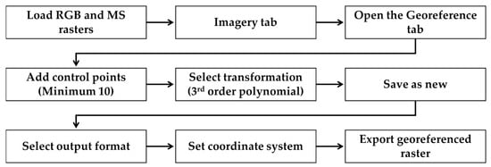 The methodology (Figure 5) employed involves georeferencing MS orthomosaic using the RGB orthomosaic as a reference through a third-order polynomial transformation model, comprising parameters for scaling, rotation, and translation using ArcGIS Pro 3.1 (Esri, Redlands, CA, USA).