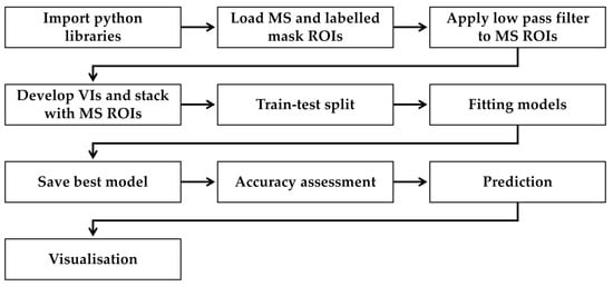 The classical ML model training and testing involved different processing steps to segment the BLP for mapping (Figure 7). After importing the essential Python libraries, the MS input ROIs, and their corresponding mask (labelled raster) ROIs were loaded. These MS input ROIs underwent preprocessing steps, including histogram equalisation for enhancement and calculation of VIs to capture relevant features, and these VIs were integrated into the input MS ROI array using concatenate function. Moreover, a low pass filter was applied to the MS ROIs to reduce noise and improve model performance. Subsequently, empty lists X and y were created to accommodate the features (X) and labeled mask (y). Subsequently, the python scripts proceeded to iterate through each MS input ROIs, filtering labeled data (Id = 1) by generating a mask based on pixel values greater than 0 in the corresponding input labelled mask. This process effectively identified the labeled regions within the mask, facilitating the extraction of features and labels. The extracted features and labels were then converted to NumPy arrays for model training. Following data preprocessing, the training dataset was split into training and testing sets using the train-test split function, allowing for the assessment of model performance on unseen data. Different classical ML classifiers with predetermined parameters were then defined, and it was fitted to the training data. Once the model was trained, the best-performing model was saved to a file for future use. Subsequently, the saved best model was loaded, and its performance was evaluated using the testing ROIs mentioned in Section 2.6.