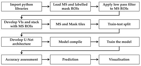 Figure 8 depicts the key processing pipeline specifically designed for training DL U-Net models, emphasising the distinct stages and methodologies essential for leveraging neural networks in image segmentation tasks. Following Python library imports, a function for the estimation of VIs is defined to compute VIs from MS input ROIs. Subsequently, the MS ROIs and labeled mask ROIs undergo a tiling process, dividing them into smaller patches (32 × 32, 64 × 64, 128 × 128, 256 × 256, 512 × 512) to streamline model training. Furthermore, masks are transformed into categorical representation through one-hot encoding, preparing them for semantic segmentation tasks. Once the data were split into training and testing sets using scikit-learn’s ‘train_test_split’ function, they were fed to DL U-Net architecture.
