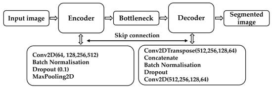 The architecture is characterised by a U-shaped structure featuring a contracting path followed by an expansive path (Figure 9). In the contracting path, the input ROIs undergo a series of convolutional layers interspersed with max-pooling operations. These layers progressively reduce the spatial dimensions of the feature maps while increasing their depth, allowing the model to capture hierarchical features at different levels of abstraction. After reaching a bottleneck layer, the expansive path begins, where the feature maps are up sampled through deconvolutional layers. Concurrently, skip connections are established between corresponding layers in the contracting and expansive paths, facilitating the integration of both local and global context information. These connections enable precise localisation of objects and improve segmentation accuracy. The model is then compiled with the Adam optimizer and categorical cross-entropy loss, marking the preparation phase for model training. At the end of the network, a convolutional layer with softmax activation is applied to generate pixel-wise predictions for each class. This produces a segmentation map where each pixel is assigned a probability distribution over the different classes, allowing for the fine-grained classification of regions within the image. After model training, the best model checkpoint is saved based on validation loss, ensuring optimal performance. Finally, the best model was evaluated by testing ROIs to assess its generalisation ability and ensure its effectiveness in segmenting unseen regions.