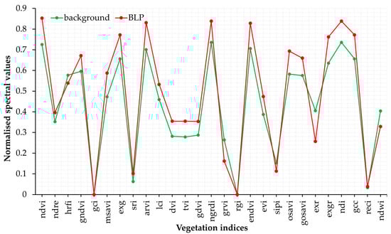 VIs derived from spectral bands including blue (B), green (G), red (R), near-infrared (NIR), and red-edge used for BLP model training and improvement.